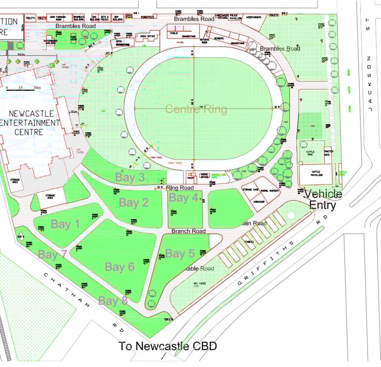 A site map showing entry points, parking areas and hall location is provided below. Note how close Broadmeadow Train is to the Exhibition Centre.
